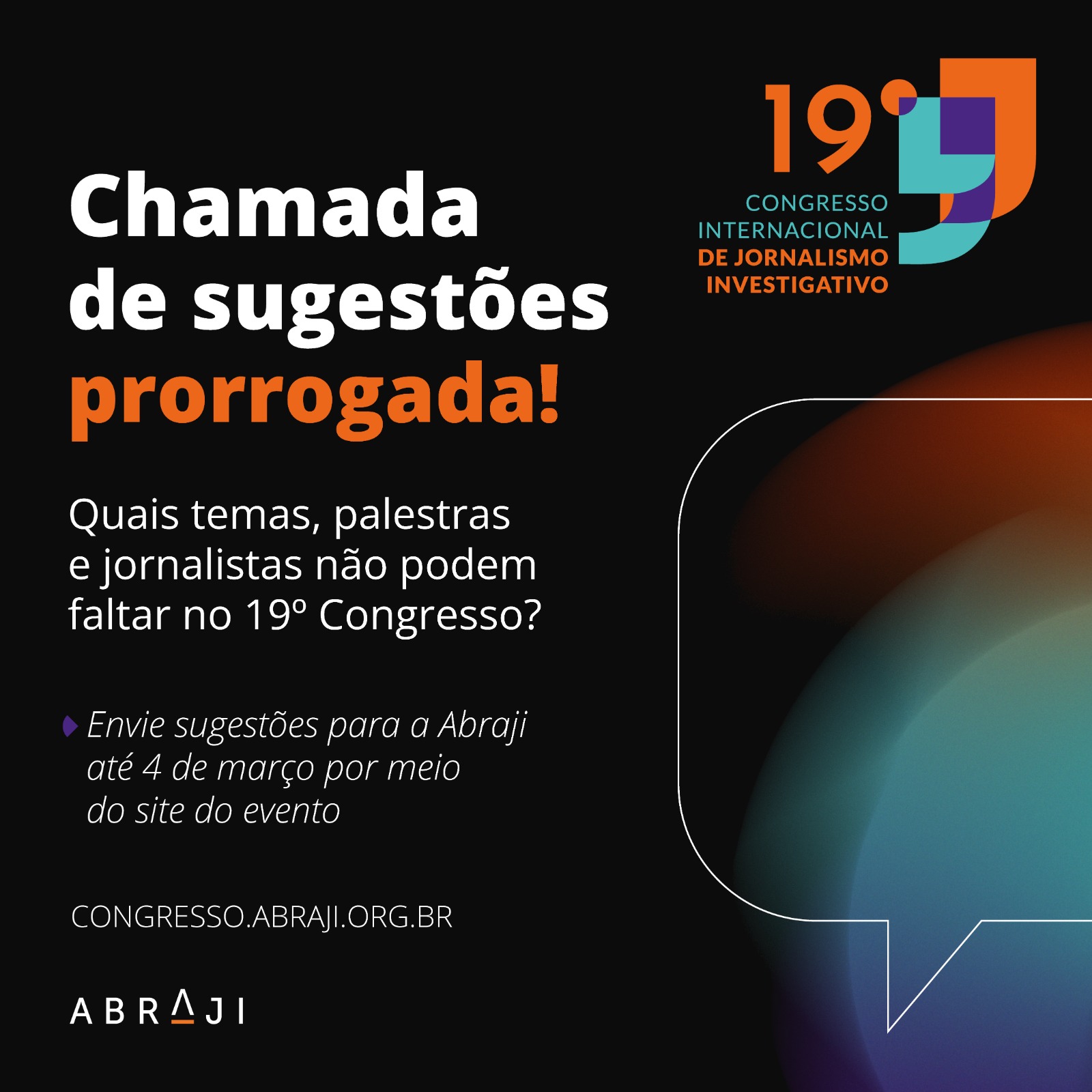 Foi prorrogado o prazo* para você enviar suas *sugestões para o 19º Congresso da Abraji! Até o dia *04/03*, você poderá sugerir quais são os *debates,...