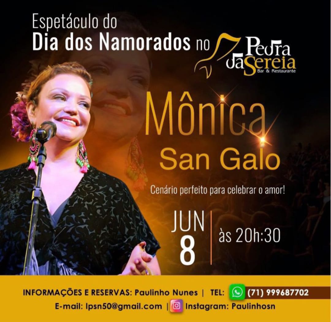 Dia 08 de junho, às 20h30, no Pedra da Sereia a cantora Monica San Galo irá celebrar o Dia dos Namorados interpretando as mais belas...