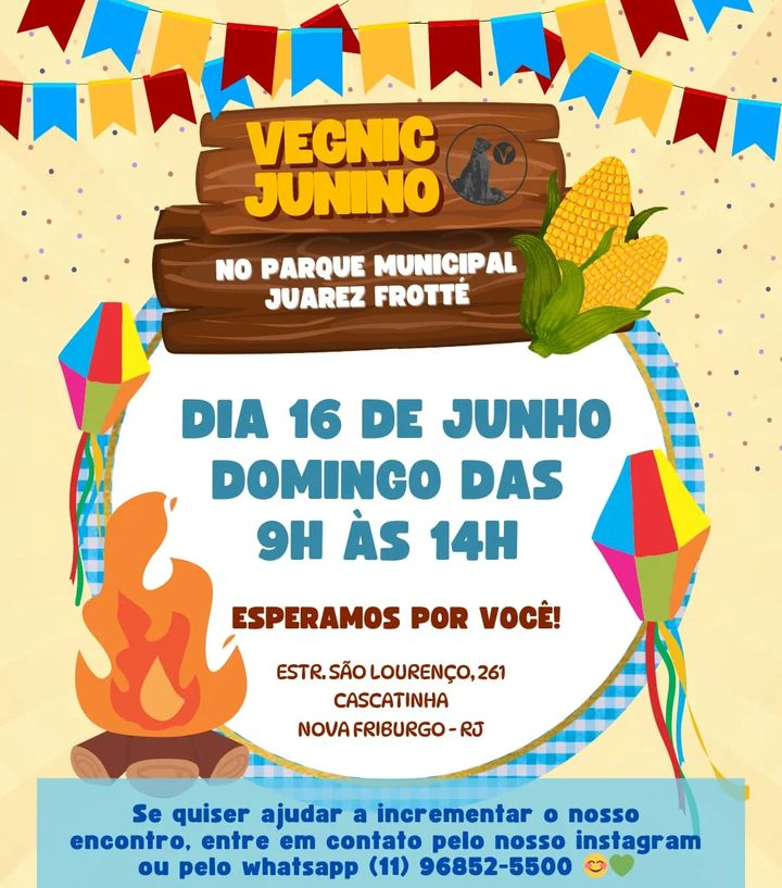 Data: 16/06 (sábado) Horário: 9h às 14h Local: Parque Juarez Frotté – Cascatinha (Estrada São Lourenço 261) – Nova Fribrgo/RJ O vegnic é para quem...
