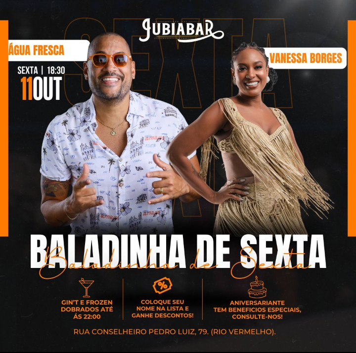 Dia 11 de outubro (sexta-feira), a partir das 18h30, você tem um encontro marcado com o cantor Água Fresca e Vanessa Borges, no estourado Jubiabar,...