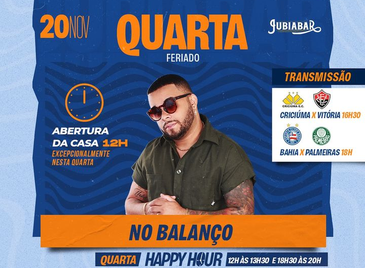 Dia 20 de novembro (quarta-feira) feriado, a partir das 12h, você tem um super encontro marcado com o show da banda No Balanço, no Jubiabar,...
