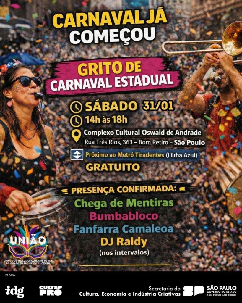 O Grito de Carnaval Estadual abre a temporada do Carnaval de Rua neste sábado (31), das 14h às 18h, no Complexo Cultural Oswald de Andrade, no Bom Retiro, com entrada gratuita. O evento acontece em um fim de semana em que gritos, ensaios e esquentas de blocos também movimentam cidades como Guarulhos, Piracicaba, São Bernardo do Campo, Limeira e diferentes regiões da capital, sinalizando que a folia já começou pelo estado.