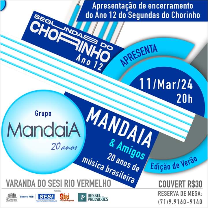 Na noite de 11 de março de 2024, segunda-feira, às 20h, na Varanda do Sesi Rio Vermelho, o grupo Mandaia encerra o projeto ‘Segundas do Chorinho – ano 12’ com show comandado pelo instrumentista Lula Gazineu, que convoca os amigos chorões para uma noite de festa, onde, juntos, passeiam pelo requinte da música brasileira,