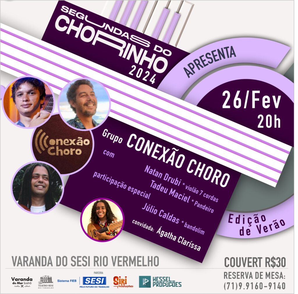 Fechando a programação do mês, o *Projeto ‘Segundas do Chorinho – ano 12’*, apresenta pela primeira vez em seu palco o trabalho do grupo *Conexão Choro, dia 26 de fevereiro de 2024, a partir das 20 horas, na Varanda do Sesi Rio Vermelho*. Nessa noite o grupo homenageia o Mestre compositor e cavaquinista Waldir Azevedo, […]
