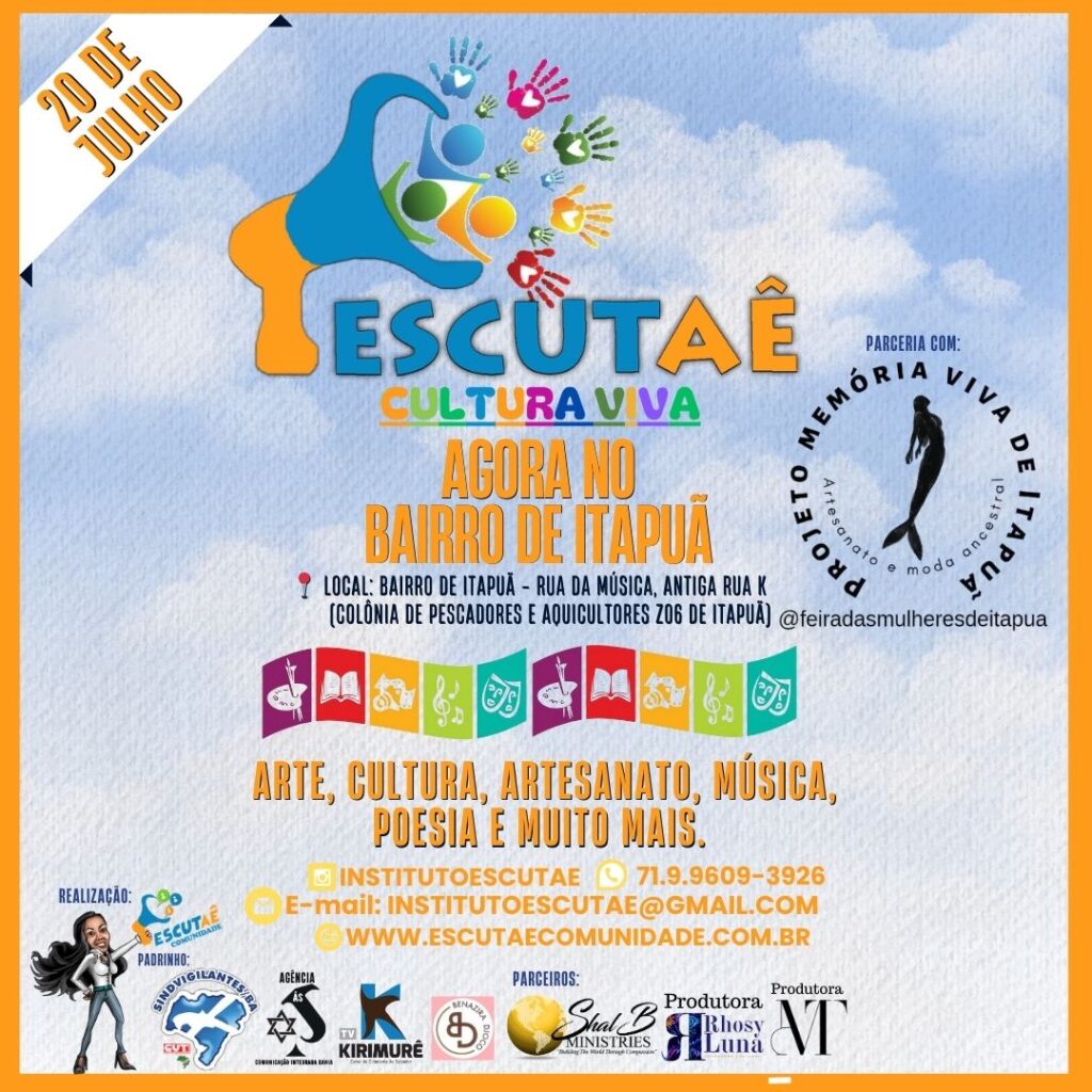 O projeto Escutaê Cultura Viva será um dia de celebração cultural que acontecerá no dia 20 de julho, a partir das 10h, na Rua da Música, antiga Rua K (Colônia de Pescadores e Aquicultores Z06), no bairro de Itapuã).