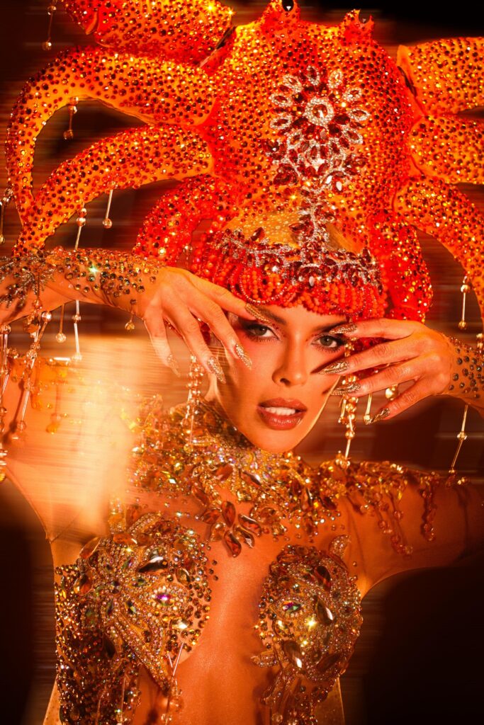 A fantasia é uma homenagem às origens e à força do mangue, berço de vida e resistência. O body totalmente fechado em pedrarias representa a areia — base que sustenta, molda e guarda a memória do território. Já o caranguejo em movimento, no topo da composição, simboliza a vida que pulsa no manguezal: adaptação, ancestralidade e sobrevivência.