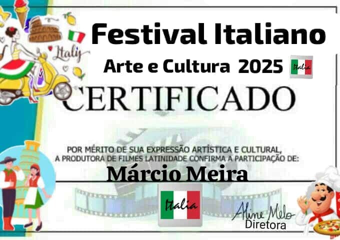Márcio Meira será premiado no dia 07 de dezembro de 2025, às 10h, no “Festival Italiano de Arte e Cultura 2025”, com parceria entre artistas da Itália e do Brasil, com objetivo de divulgar e valorizar o trabalho de artistas e profissionais de ambos os países.