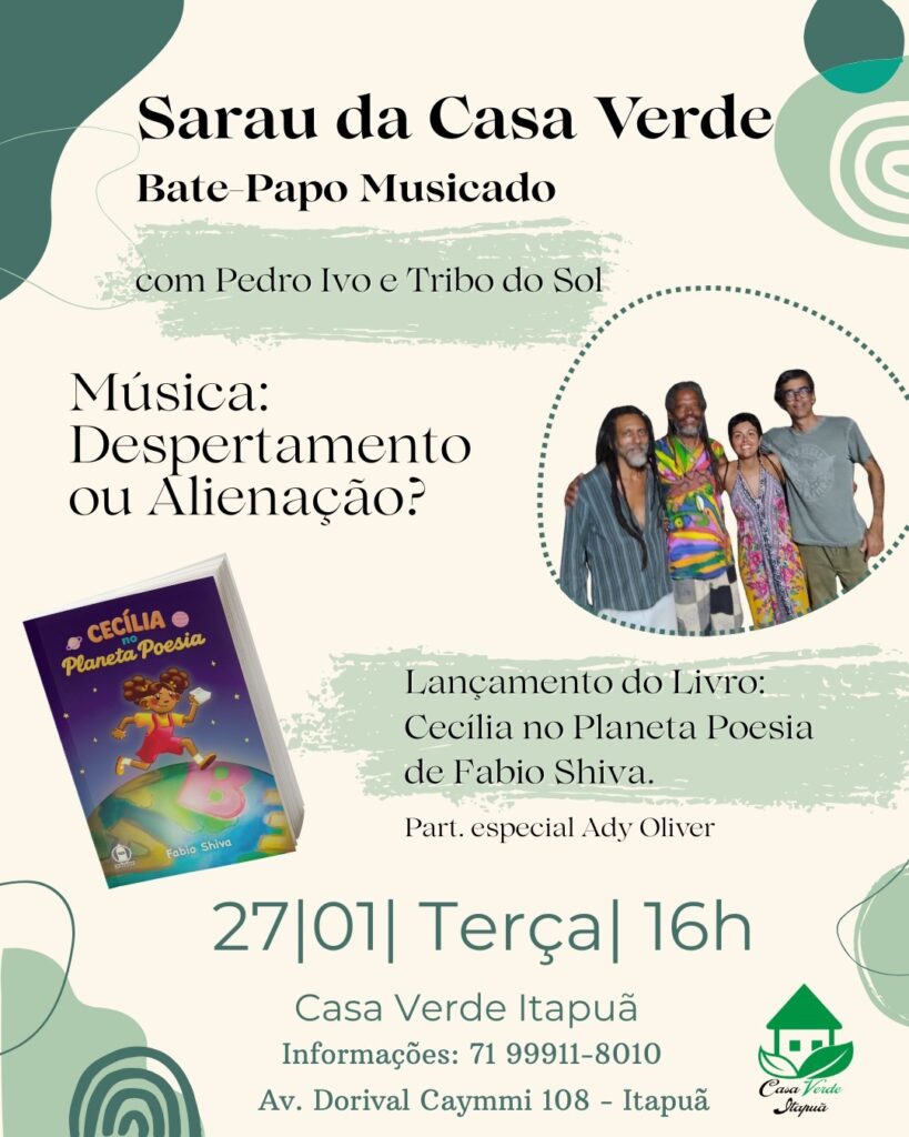 Na próxima terça-feira, 27 de janeiro, acontece o Sarau da Casa Verde, com apresentação da banda Tribo do Sol e o lançamento do livro Cecília no Planeta Poesia, de Fabio Shiva. O evento, que tem a coordenação de Amadeu Alves, traz ainda um instigante bate-papo musicado com o tema: “Música: despertamento ou alienação?” A entrada é gratuita e o Sarau começa às 16h na Casa Verde Itapuã (Av. Dorival Caymmi, 108). O evento será também transmitido pelo Instagram (@casaverdeitapua). Informações pelo WhatsApp (71) 99911-8010. O Sarau é uma parceria da Casa Verde Itapuã com o Núcleo de Estudos Multiculturais (NEM).