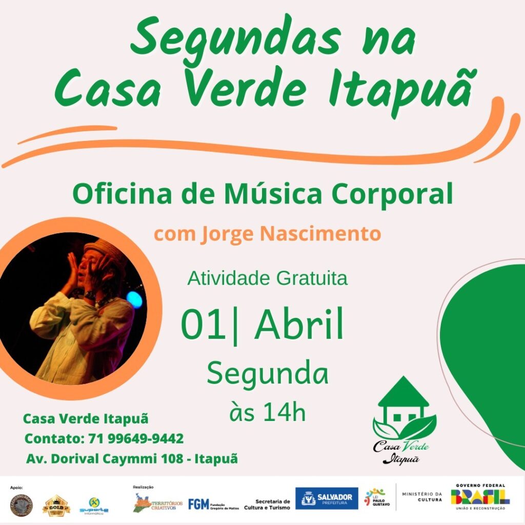 O card traz uma foto de Jorge Nascimento com as palmas das mãos abertas diante do rosto, como se estivesse realizando uma percussão corporal. Há também os dizeres: “Segundas na Casa Verde Itapuã / Oficina de Música Corporal com Jorge Nascimento / Atividade gratuita / 01 – Abril – Segunda – às 14h / Casa Verde Itapuã / Contato: 71 99649-9442 / Av. Dorival Caymmi 108 – Itapuã”. O card traz também as marcas de apoio e realização do projeto.