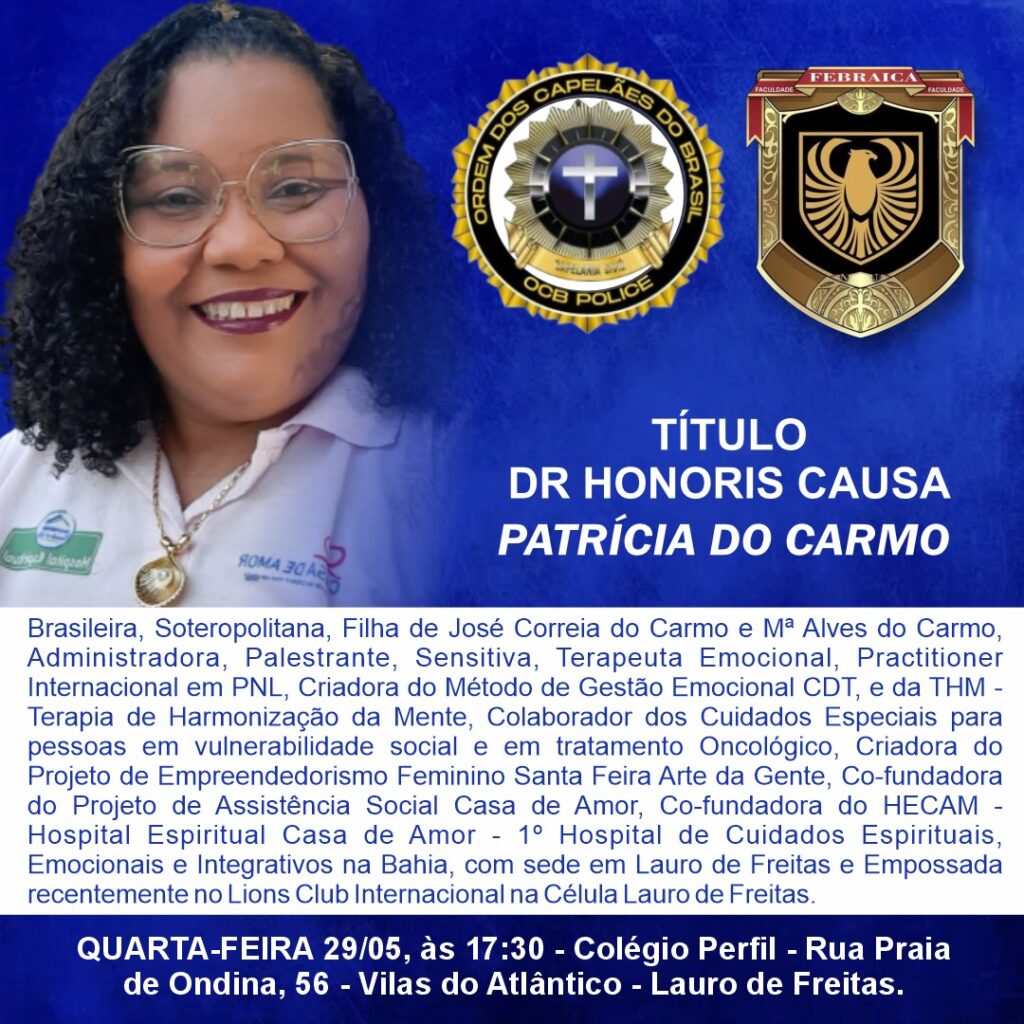 No dia 29 de maio, será Outorgada Drª Honoris Causa pela Faculdade FEBRAICA e OCB Ordem dos Capelães do Brasil.