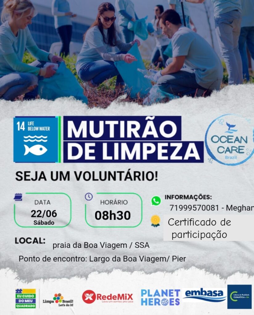 Neste Sábado dia 22 de Junho, às 08h30 vamos juntos fazer a nossa parte para deixar a praia da Boa Viagem em Salvador Bahia ainda mais bonita e livre do plástico!