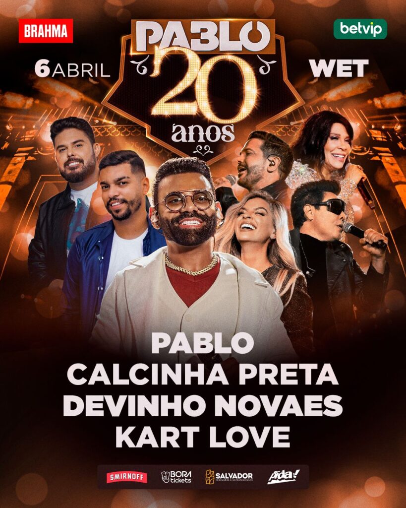 Os 20 anos de carreira do cantor Pablo vão ser celebrados em grande estilo em Salvador. A turnê comemorativa de duas décadas de sucesso vai reunir o rei do arrocha em uma note única e especial, no dia 6 de abril, no Wet.