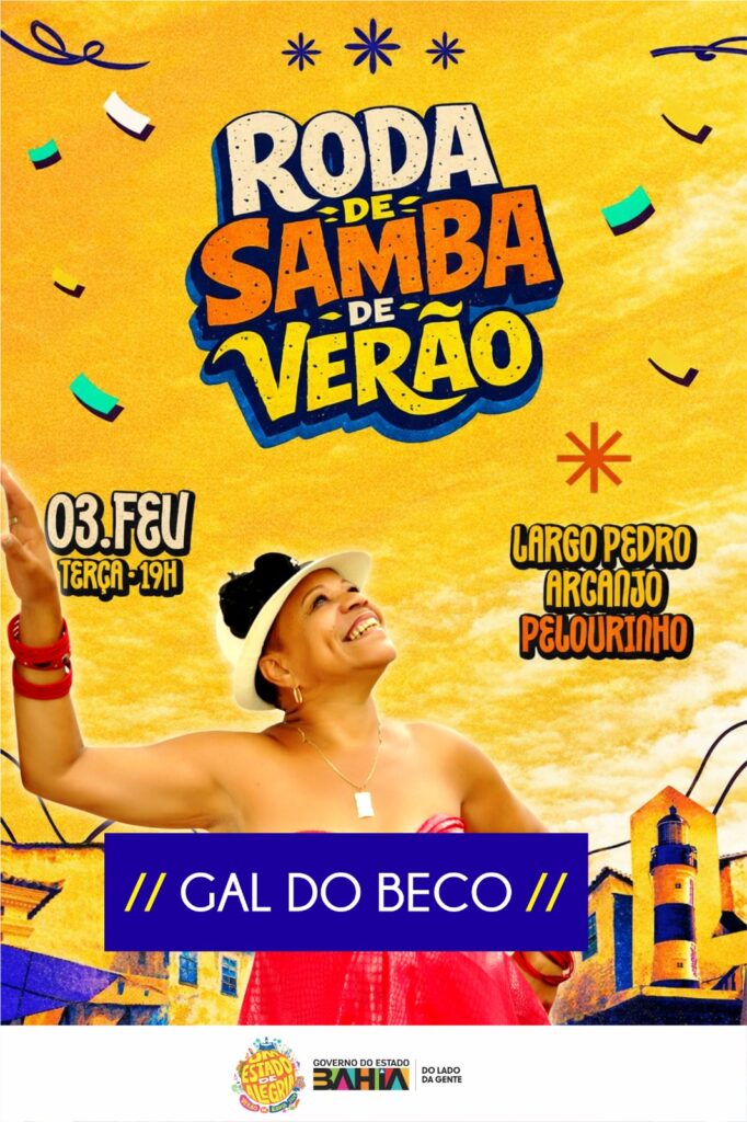 Nesta Terça-feira (03/02), a nossa querida Gal do Beco renomada cantora e sambista, nascida no Rio de Janeiro radicada na Bahia, reconhecida como uma figura importante na ponte entre a vanguarda e a nova geração de sambistas estará no Largo Pedro Arcanjo (Pelourinho) levando toda sua musicalidade, axé e carisma para o público baiano e turistas.